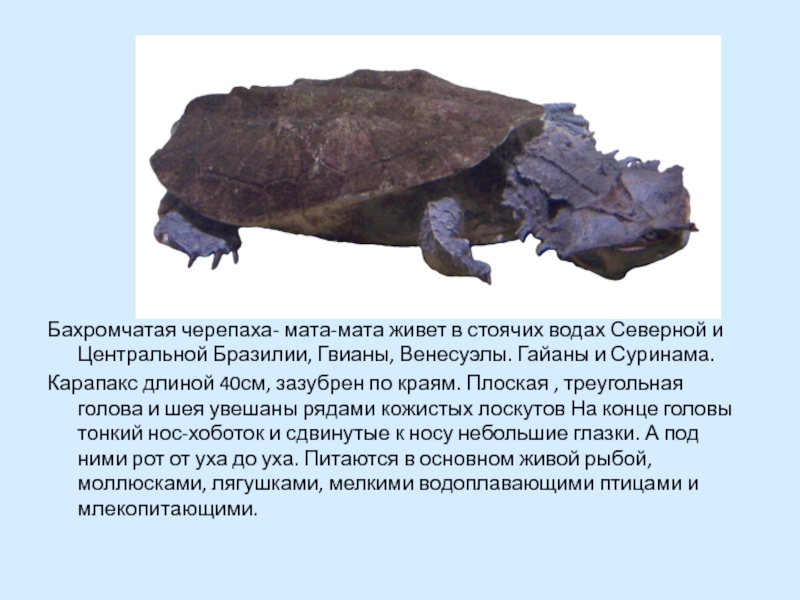 Бахромчатая черепаха- мата-мата живет в стоячих водах Северной и Центральной Бразилии,