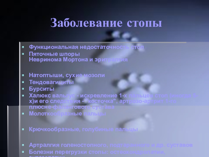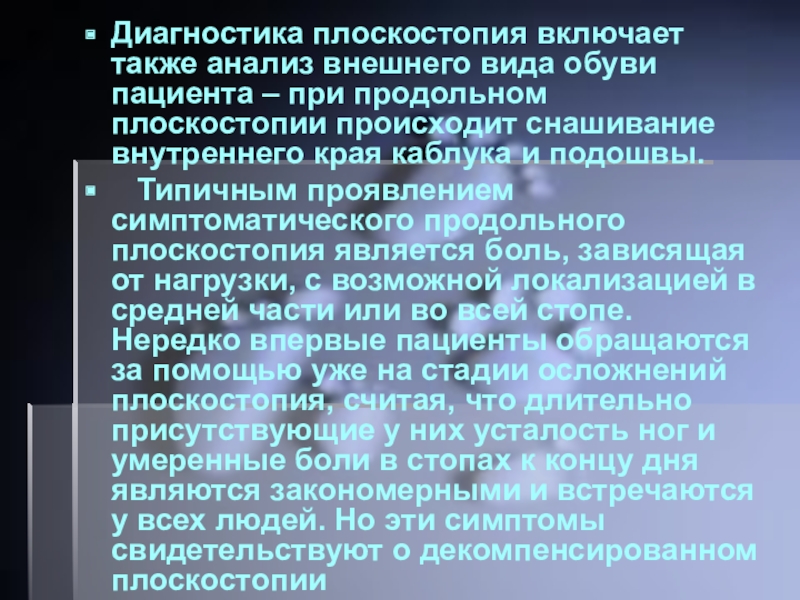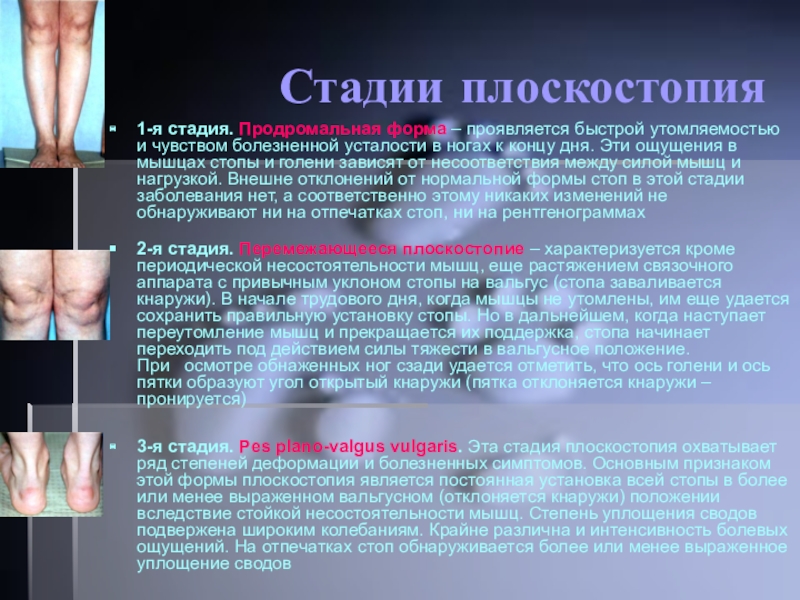 чувством болезненной усталости в ногах к концу дня. Эти ощущения в мышцах стопы и голени зависят от несоответствия между силой мышц и нагрузкой. Внешне отклонений от нормальной формы стоп в этой стадии заболевания нет, а соответственно этому никаких изменений не обнаруживают ни на отпечатках стоп, ни на рентгенограммах