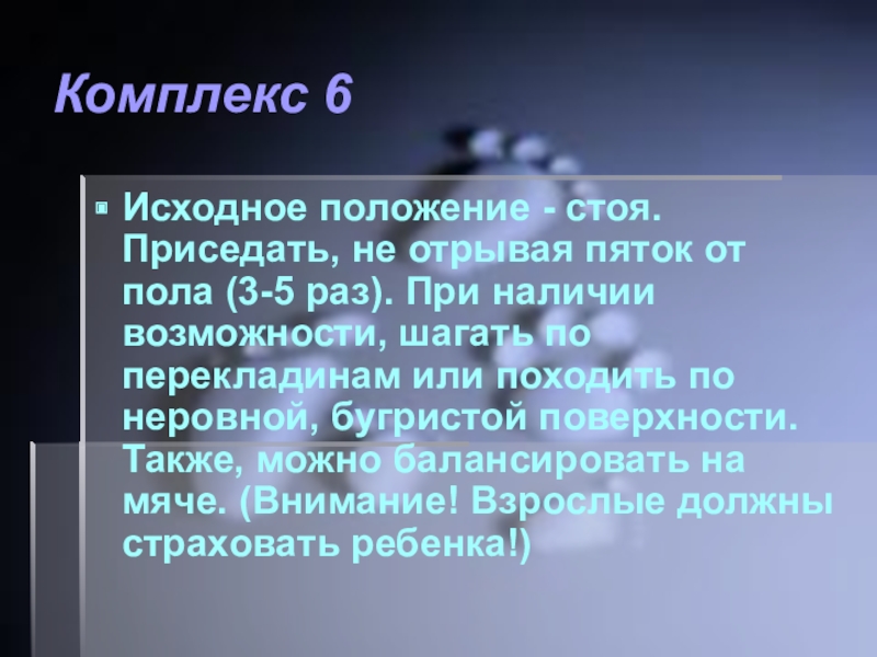 пола (3-5 раз). При наличии возможности, шагать по перекладинам или походить по неровной, бугристой поверхности. Также, можно балансировать на мяче. (Внимание! Взрослые должны страховать ребенка!)