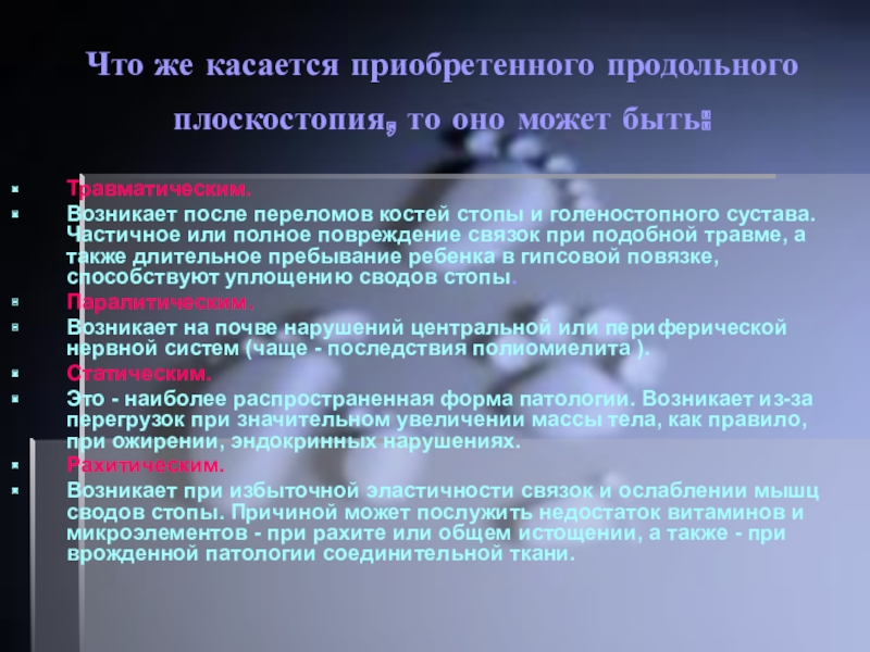 Слайд 19Что же касается приобретенного продольного плоскостопия, то оно может быть: