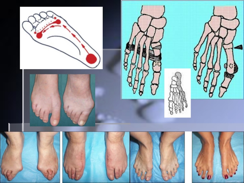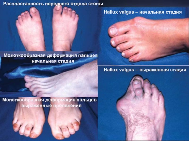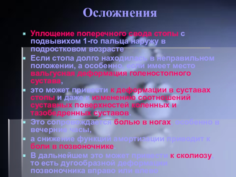 Резко выраженная деформация стопы. Постоянная боль в стопах, голенях, коленных суставах, отечность. Появление боли в пояснице, мучительные головные боли.