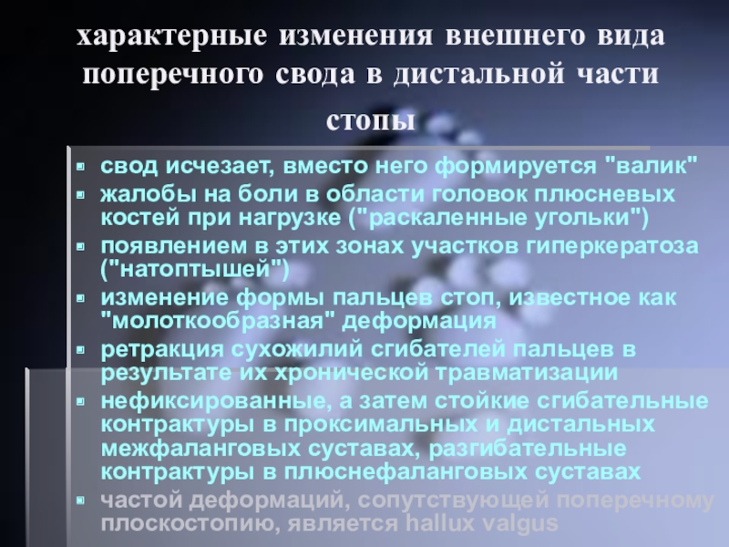При поперечном - уплощается поперечная арка, передний отдел стопы веерообразно расходится и опирается на головки пяти плюсневых костей