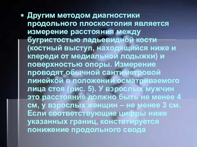 Слайд 42Другим методом диагностики продольного плоскостопия является измерение расстояния между бугристостью ладьевидной