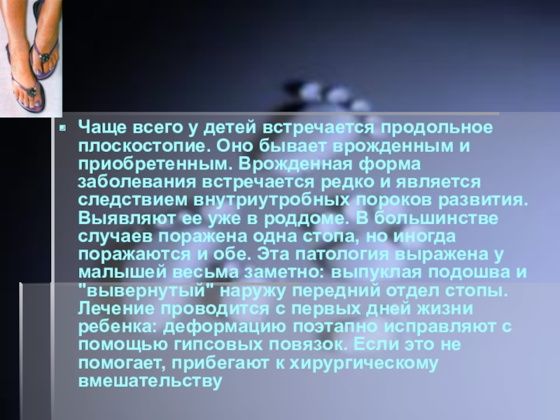 Чаще всего у детей встречается продольное плоскостопие. Оно бывает врожденным и