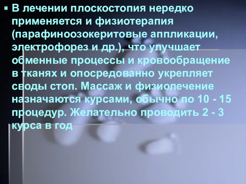 Слайд 57В лечении плоскостопия нередко применяется и физиотерапия (парафиноозокеритовые аппликации, электрофорез и