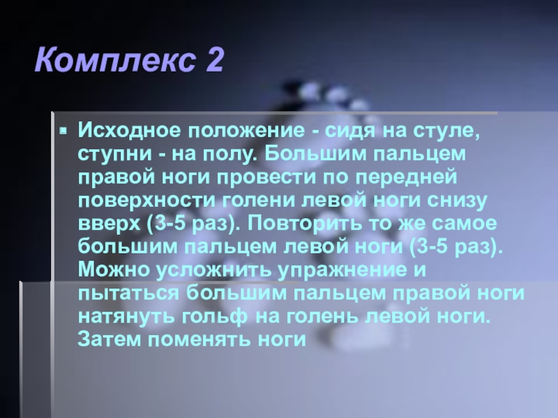 полу. Большим пальцем правой ноги провести по передней поверхности голени левой ноги снизу вверх (3-5 раз). Повторить то же самое большим пальцем левой ноги (3-5 раз). Можно усложнить упражнение и пытаться большим пальцем правой ноги натянуть гольф на голень левой ноги. Затем поменять ноги