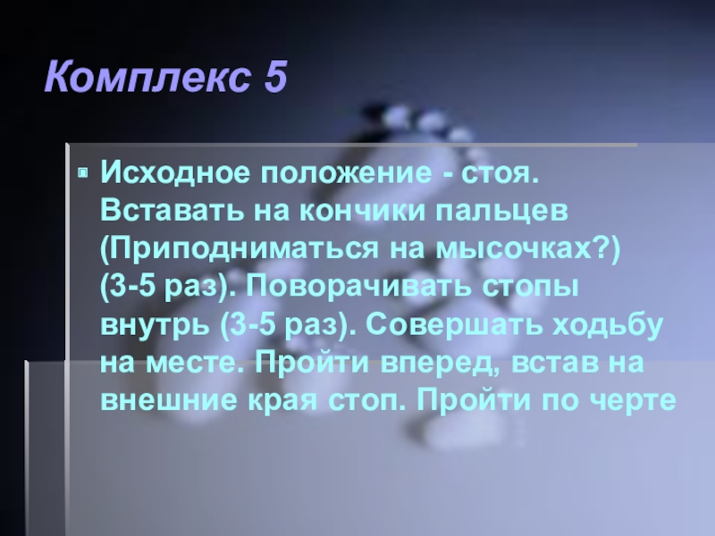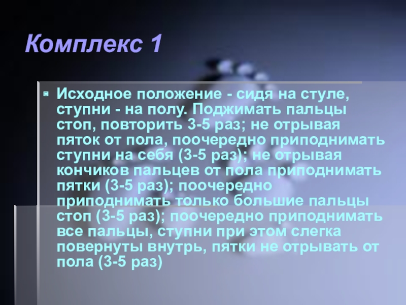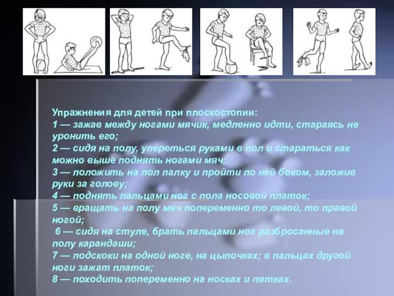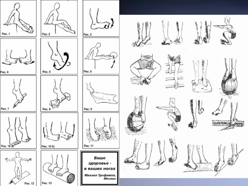 полу. Поджимать пальцы стоп, повторить 3-5 раз; не отрывая пяток от пола, поочередно приподнимать ступни на себя (3-5 раз); не отрывая кончиков пальцев от пола приподнимать пятки (3-5 раз); поочередно приподнимать только большие пальцы стоп (3-5 раз); поочередно приподнимать все пальцы, ступни при этом слегка повернуты внутрь, пятки не отрывать от пола (3-5 раз)