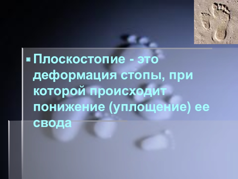 Слайд 2Плоскостопие - это деформация стопы, при которой происходит понижение (уплощение) ее