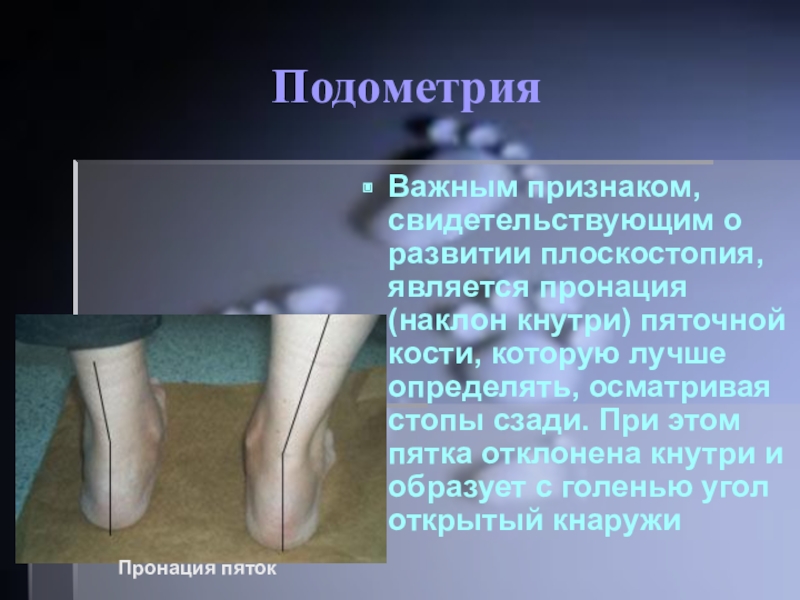 Важным признаком, свидетельствующим о развитии плоскостопия, является пронация (наклон кнутри)