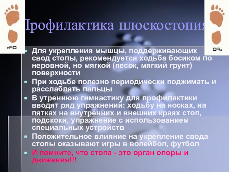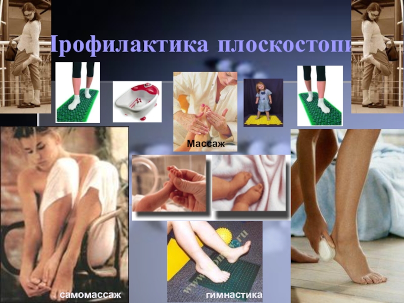 В утреннюю гимнастику для профилактики вводят ряд упражнений: ходьбу на носках, на пятках на внутренних и внешних краях стоп, подскоки, упражнение с использованием специальных устройств