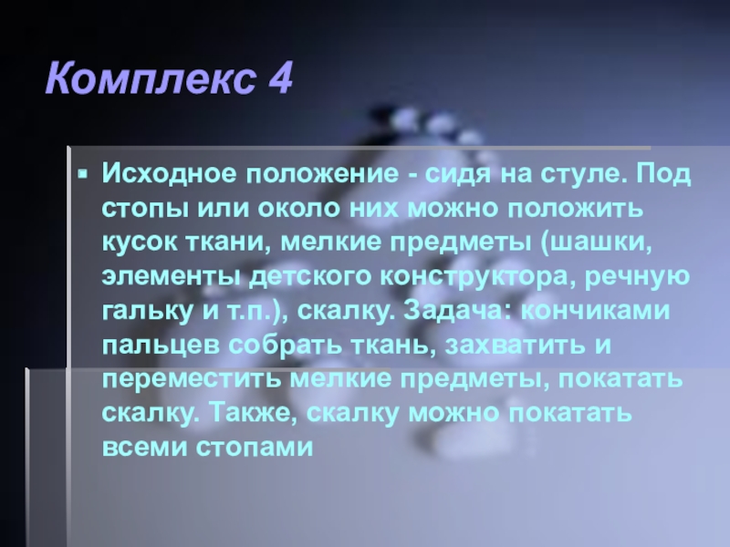 около них можно положить кусок ткани, мелкие предметы (шашки, элементы детского конструктора, речную гальку и т.п.), скалку. Задача: кончиками пальцев собрать ткань, захватить и переместить мелкие предметы, покатать скалку. Также, скалку можно покатать всеми стопами