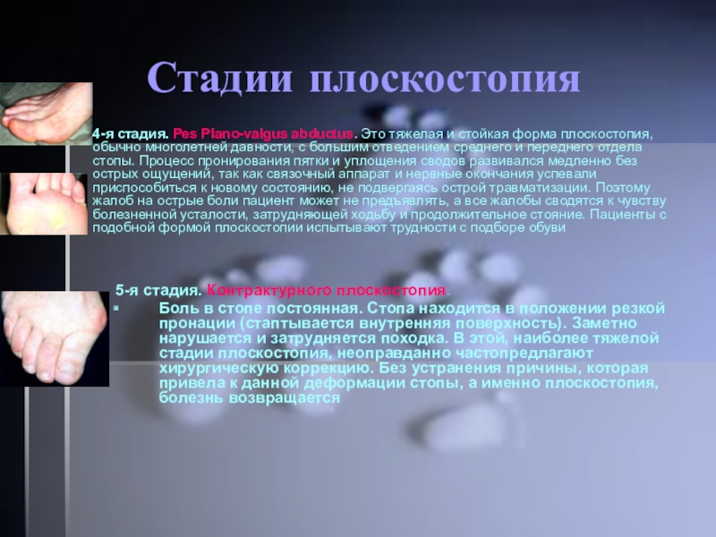 Боль в стопе постоянная. Стопа находится в положении резкой пронации (стаптывается внутренняя поверхность). Заметно нарушается и затрудняется походка. В этой, наиболее тяжелой стадии плоскостопия, неоправданно частопредлагают хирургическую коррекцию. Без устранения причины, которая привела к данной деформации стопы, а именно плоскостопия, болезнь возвращается