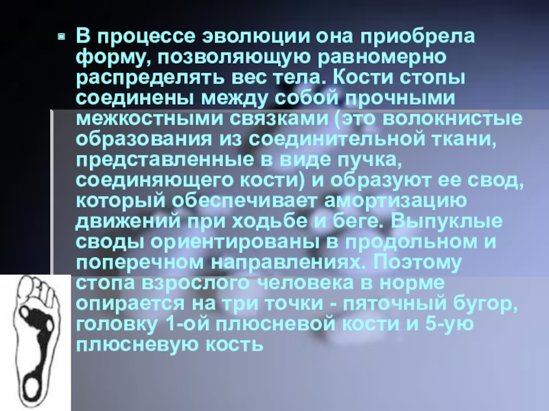 Слайд 3В процессе эволюции она приобрела форму, позволяющую равномерно распределять вес тела.