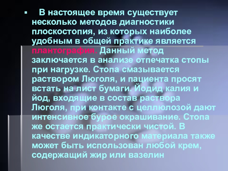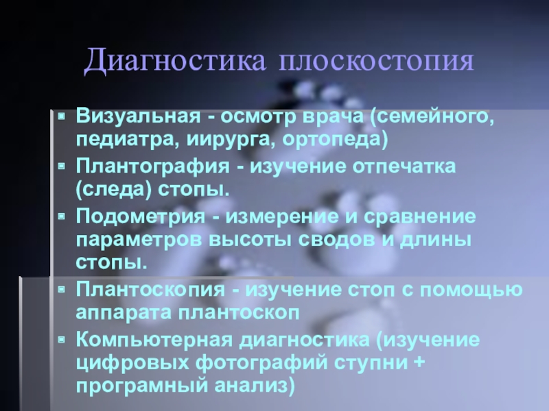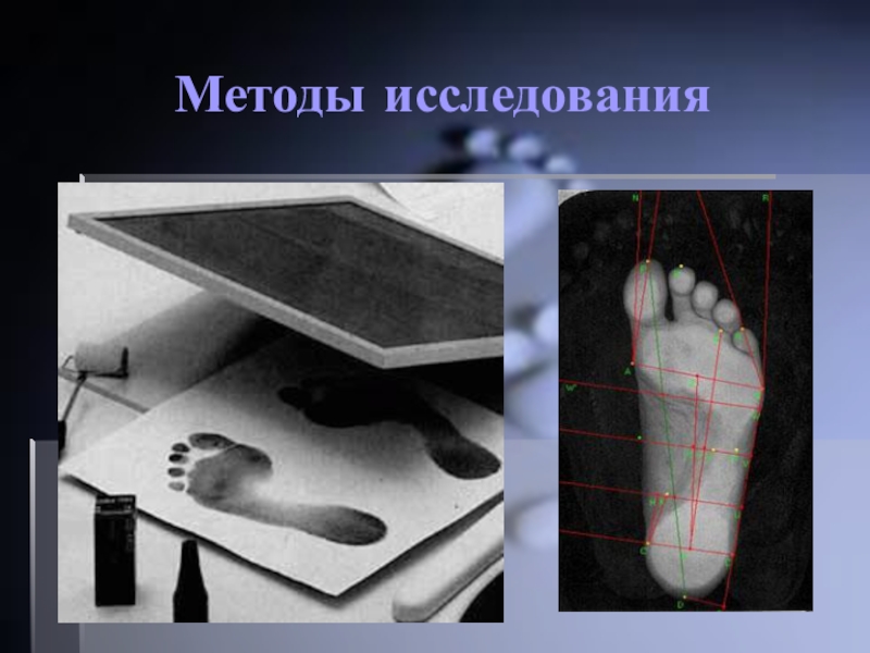 Слайд 40 В настоящее время существует несколько методов диагностики плоскостопия, из которых наиболее