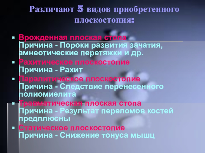 Слайд 18Различают 5 видов приобретенного плоскостопия: