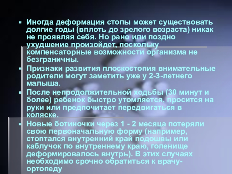 Слайд 38Иногда деформация стопы может существовать долгие годы (вплоть до зрелого возраста)
