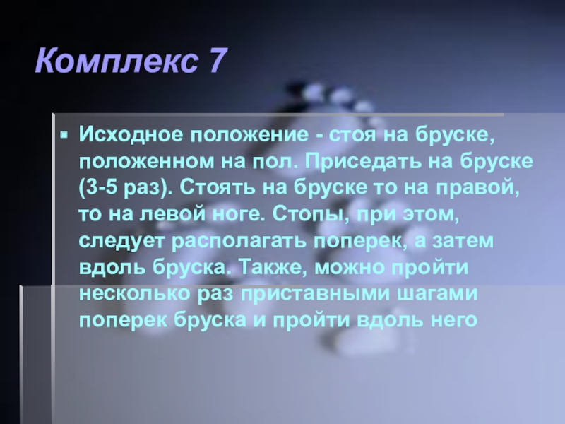 Приседать на бруске (3-5 раз). Стоять на бруске то на правой, то на левой ноге. Стопы, при этом, следует располагать поперек, а затем вдоль бруска. Также, можно пройти несколько раз приставными шагами поперек бруска и пройти вдоль него