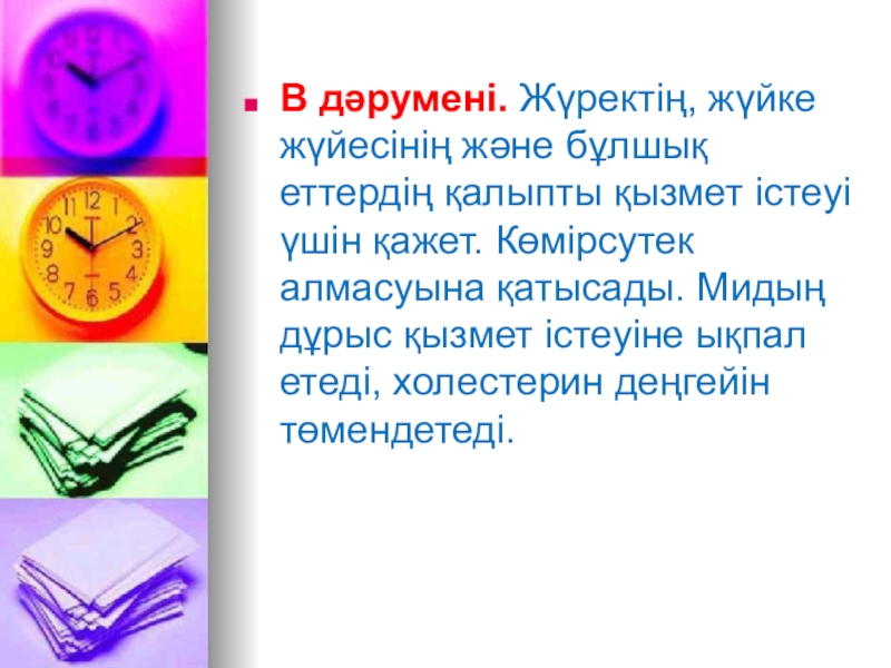Слайд 27В дәрумені. Жүректің, жүйке жүйесінің және бұлшық еттердің қалыпты қызмет істеуі