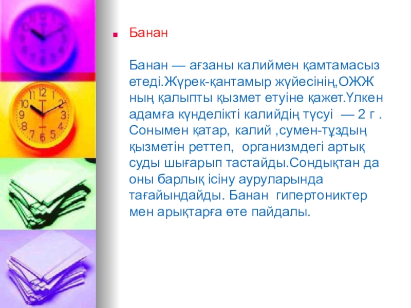 Банан — ағзаны калиймен қамтамасыз етеді.Жүрек-қантамыр жүйесінің,ОЖЖ ның қалыпты қызмет етуіне