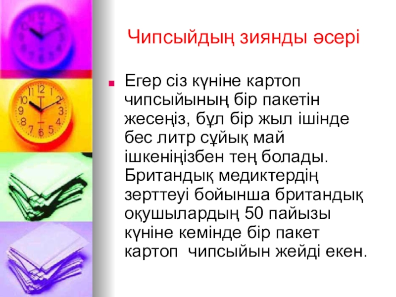 бір жыл ішінде бес литр сұйық май ішкеніңізбен тең болады. Британдық медиктердің зерттеуі бойынша британдық оқушылардың 50 пайызы күніне кемінде бір пакет картоп чипсыйын жейді екен.