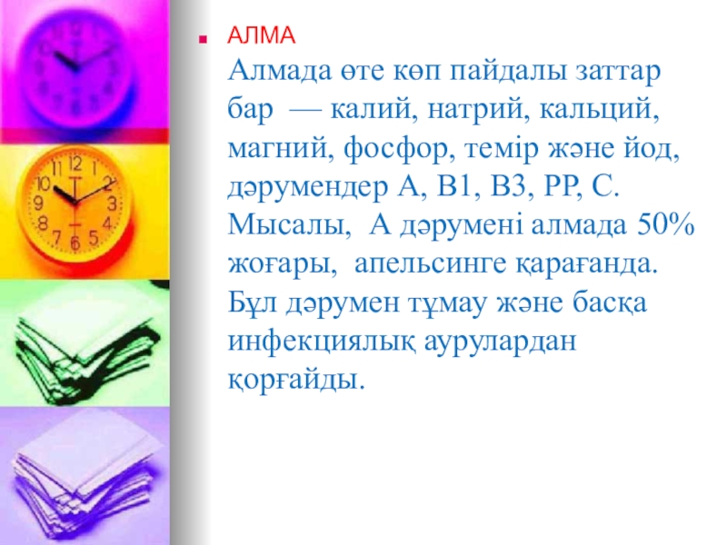 темір және йод, дәрумендер А, В1, В3, РР, С. Мысалы, А дәрумені алмада 50% жоғары, апельсинге қарағанда. Бұл дәрумен тұмау және басқа инфекциялық аурулардан қорғайды.