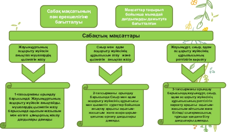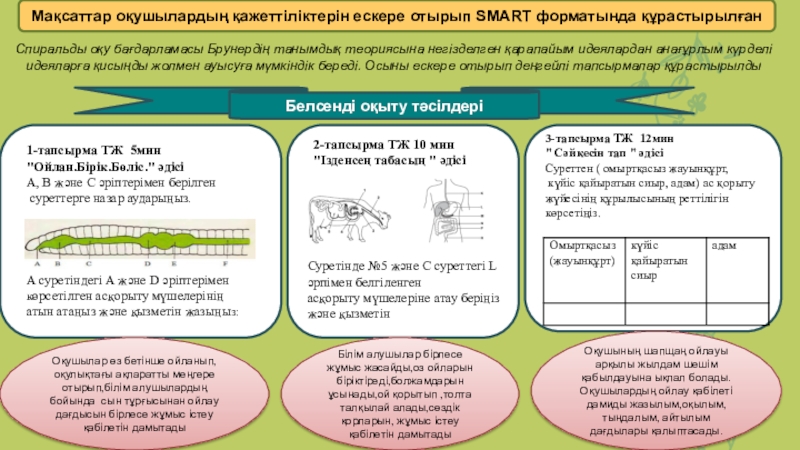 3-тапсырманы орындау барысында,жауынқұрт, сиыр, адам ас қорыту жүйесінің құрылысының реттілігін көрсету арқылы оқылым-жазылым-айтылым және білімді шығармашылық тұрғыда қолдана білу дағдылары дамиды.