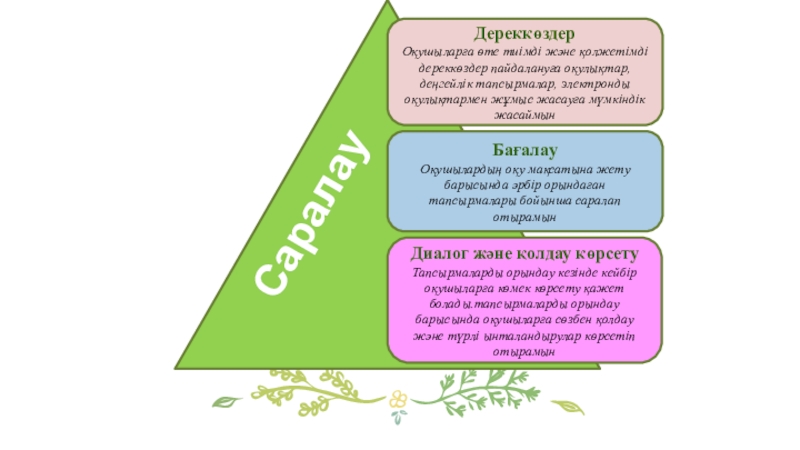 Диалог және қолдау көрсету Тапсырмаларды орындау кезінде кейбір оқушыларға көмек көрсету қажет болады.тапсырмаларды орындау барысында оқушыларға сөзбен қолдау және түрлі ынталандырулар көрсетіп отырамын