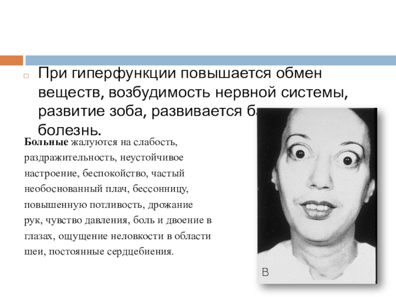 Больные жалуются на слабость, раздражительность, неустойчивое настроение, беспокойство, частый необоснованный плач, бессонницу, повышенную потливость, дрожание рук, чувство давления, боль и двоение в глазах, ощущение неловкости в области шеи, постоянные сердцебиения.