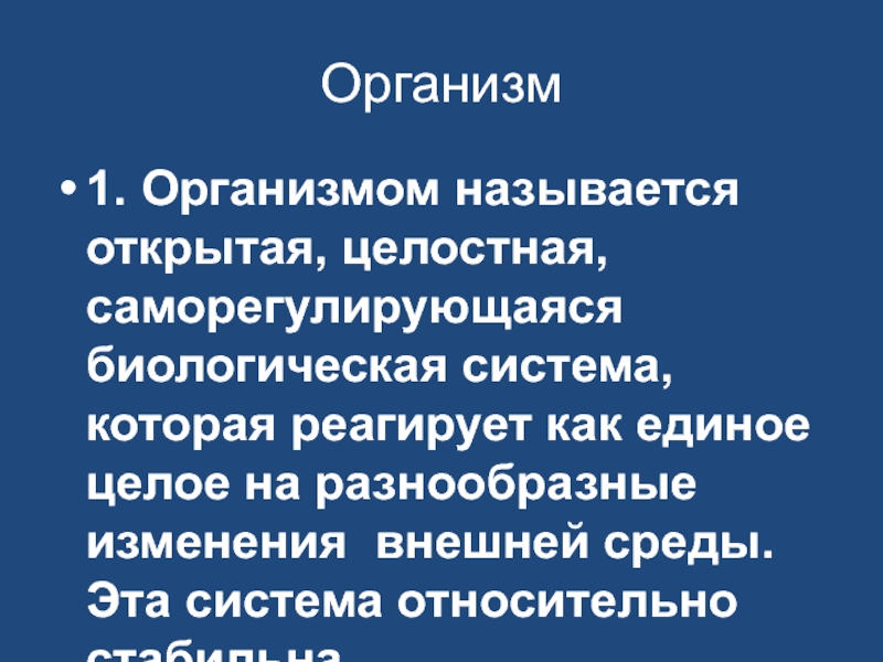 1. Организмом называется открытая, целостная, саморегулирующаяся биологическая система, которая реагирует как единое