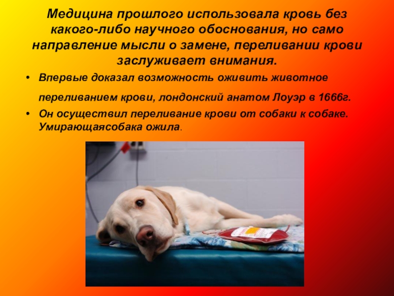 Он осуществил переливание крови от собаки к собаке. Умирающаясобака ожила.