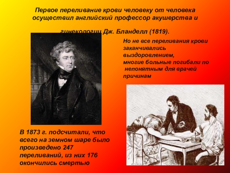 В 1873 г. подсчитали, что всего на земном шаре было произведено 247 переливаний, из них 176 окончились смертью
