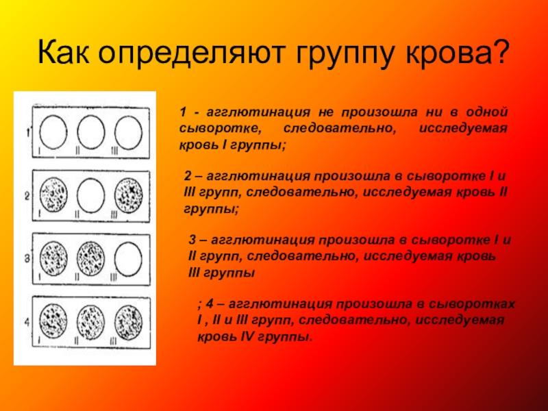 ; 4 – агглютинация произошла в сыворотках I , II и III групп, следовательно, исследуемая кровь IV группы.