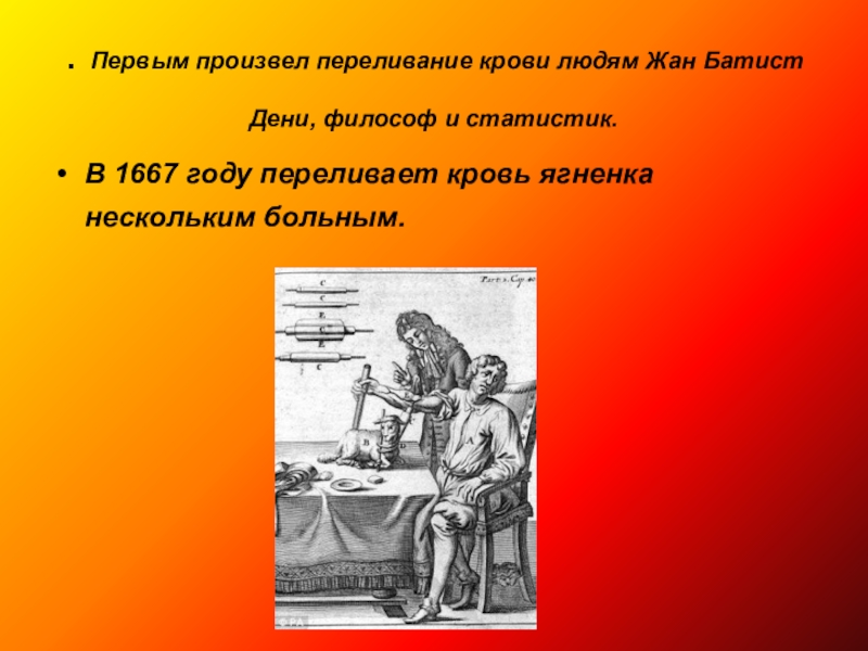 В 1667 году переливает кровь ягненка нескольким больным.
