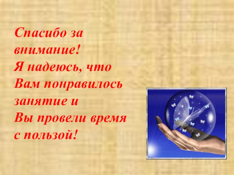 Слайд 24Спасибо за внимание! Я надеюсь, что Вам понравилось занятие и Вы провели