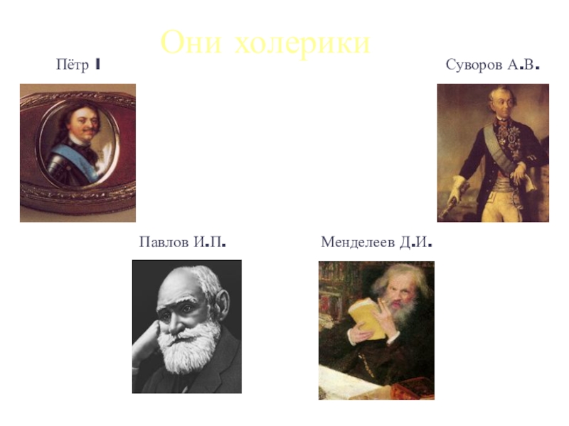 Они холерикиСуворов А.В. Пётр IМенделеев Д.И.Павлов И.П.