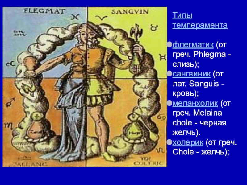 Типы темпераментафлегматик (от греч. Phlegma - слизь); сангвиник (от лат. Sanguis - кровь); меланхолик (от греч. Melaina