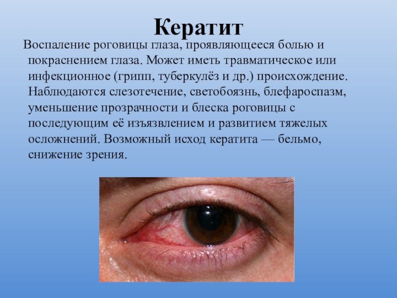 Воспаление роговицы глаза, проявляющееся болью и покраснением глаза. Может