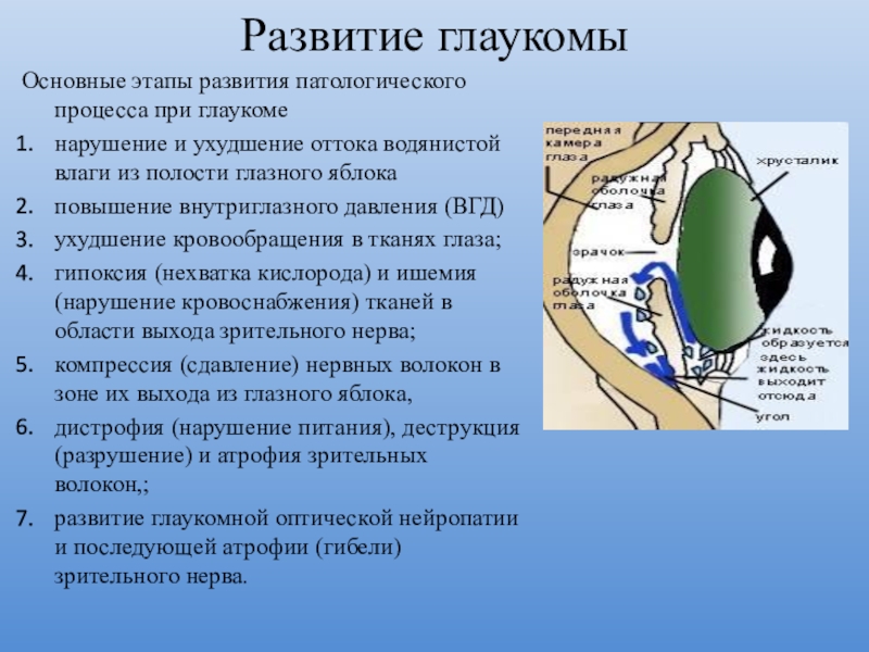 развитие глаукомной оптической нейропатии и последующей атрофии (гибели) зрительного нерва.