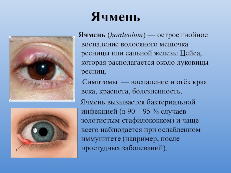 Ячмень вызывается бактериальной инфекцией (в 90—95 % случаев — золотистым стафилококком) и чаще всего наблюдается при ослабленном иммунитете (например, после простудных заболеваний).