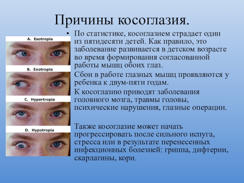 К косоглазию приводят заболевания головного мозга, травмы головы, психические нарушения, глазные операции.