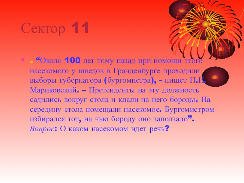 у шведов в Гранденбурге проходили выборы губернатора (бургомистра), - пишет П.И. Мариковский. – Претенденты на эту должность садились вокруг стола и клали на него бороды. На середину стола помещали насекомое. Бургомистром избирался тот, на чью бороду оно заползало”. Вопрос: О каком насекомом идет речь?