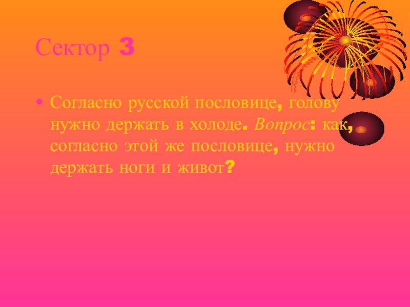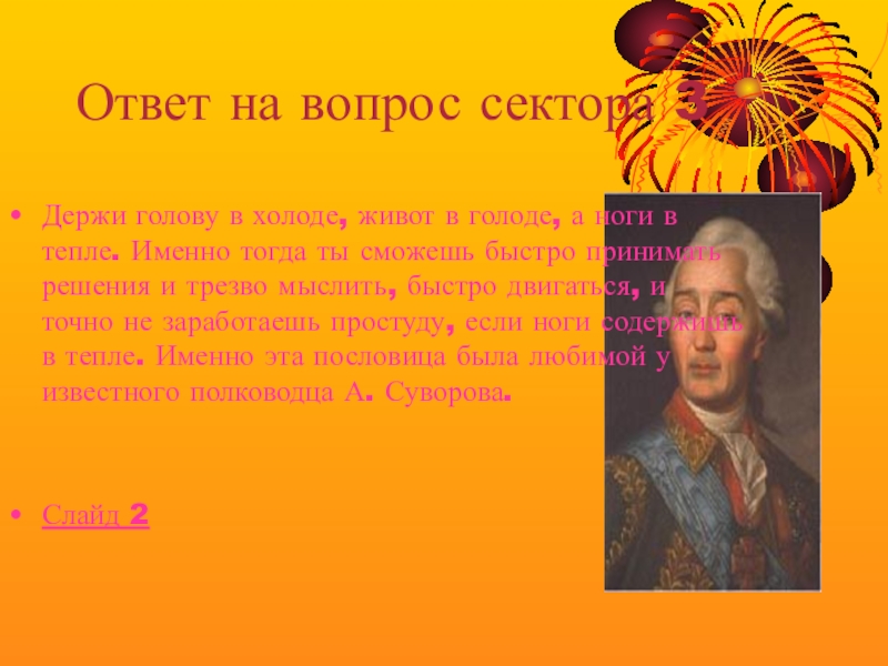 а ноги в тепле. Именно тогда ты сможешь быстро принимать решения и трезво мыслить, быстро двигаться, и точно не заработаешь простуду, если ноги содержишь в тепле. Именно эта пословица была любимой у известного полководца А. Суворова.