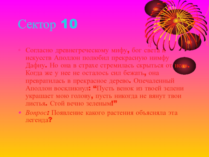 нимфу Дафну. Но она в страхе стремилась скрыться от него. Когда же у нее не осталось сил бежать, она превратилась в прекрасное дерево. Опечаленный Аполлон воскликнул: “Пусть венок из твоей зелени украшает мою голову, пусть никогда не вянут твои листья. Стой вечно зеленым!”
