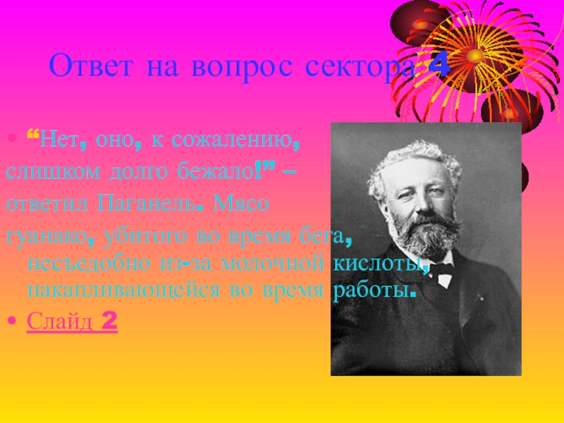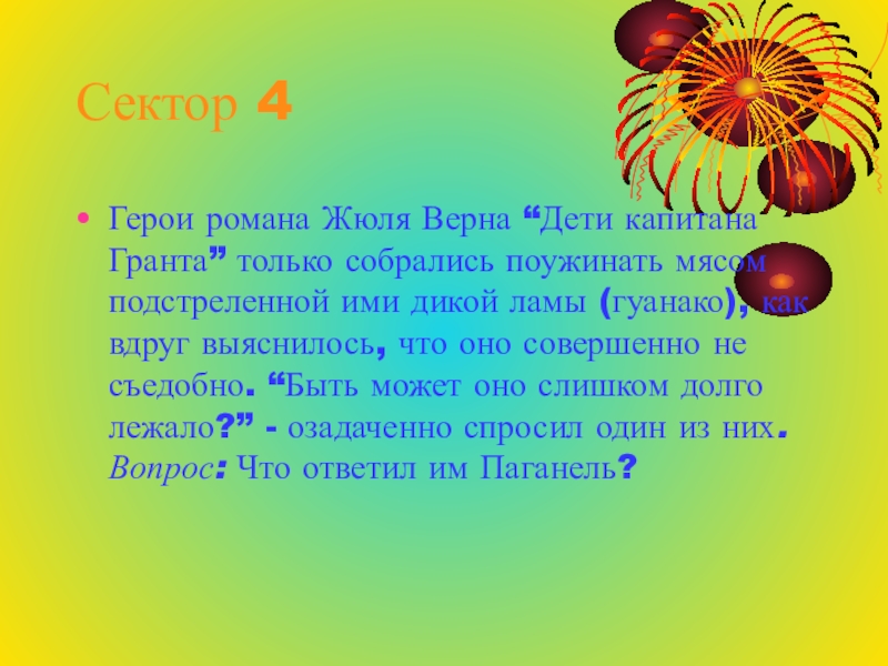 мясом подстреленной ими дикой ламы (гуанако), как вдруг выяснилось, что оно совершенно не съедобно. “Быть может оно слишком долго лежало?” - озадаченно спросил один из них. Вопрос: Что ответил им Паганель?
