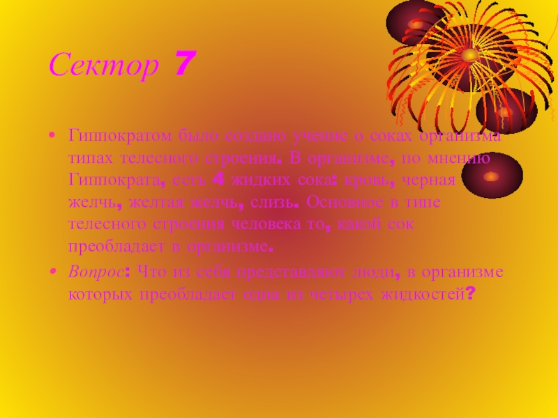 В организме, по мнению Гиппократа, есть 4 жидких сока: кровь, черная желчь, желтая желчь, слизь. Основное в типе телесного строения человека то, какой сок преобладает в организме.