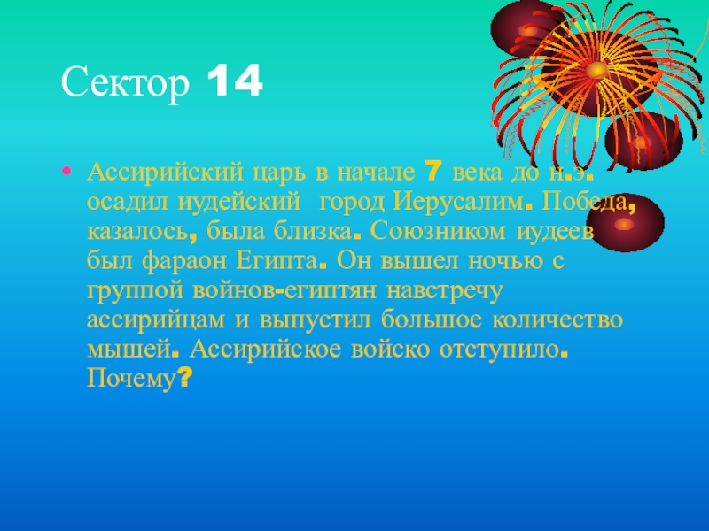 город Иерусалим. Победа, казалось, была близка. Союзником иудеев был фараон Египта. Он вышел ночью с группой войнов-египтян навстречу ассирийцам и выпустил большое количество мышей. Ассирийское войско отступило. Почему?