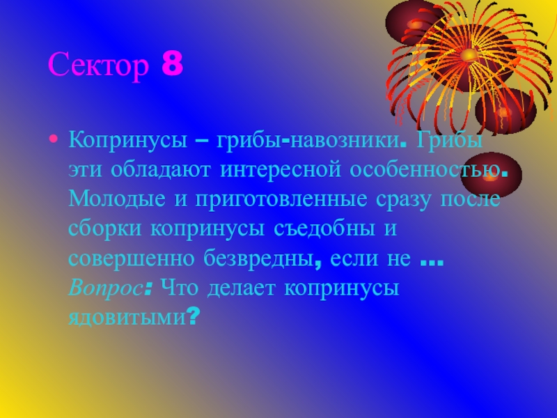 приготовленные сразу после сборки копринусы съедобны и совершенно безвредны, если не … Вопрос: Что делает копринусы ядовитыми?