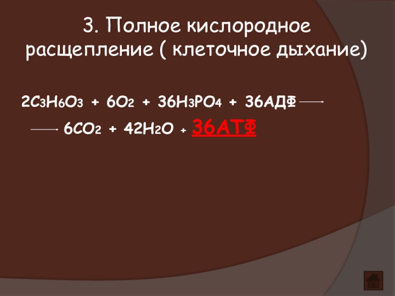3. Полное кислородное расщепление ( клеточное дыхание)2С3Н6О3 + 6О2 + 36Н3РО4 + 36АДФ