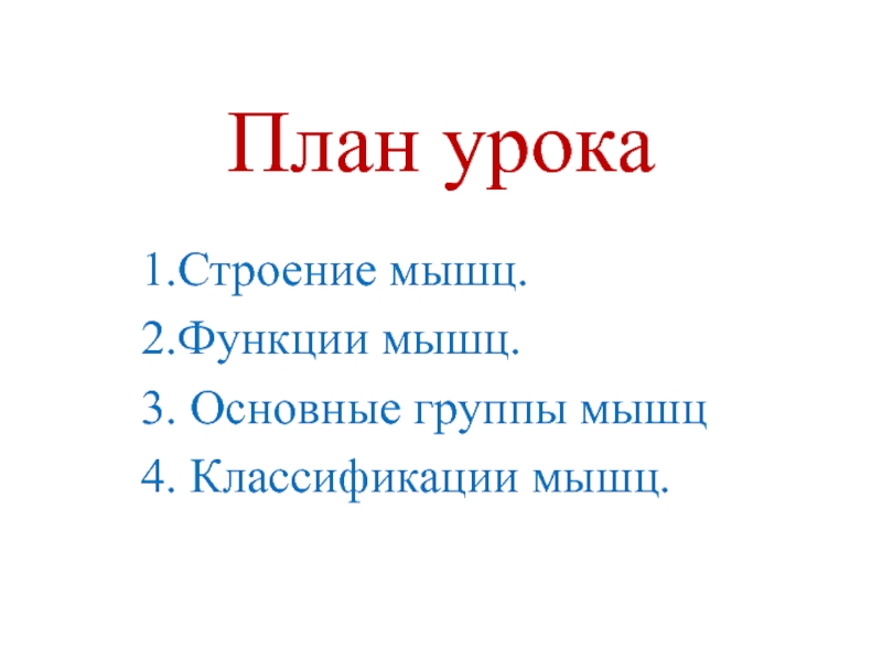 План урока1.Строение мышц.2.Функции мышц.3. Основные группы мышц4. Классификации мышц.