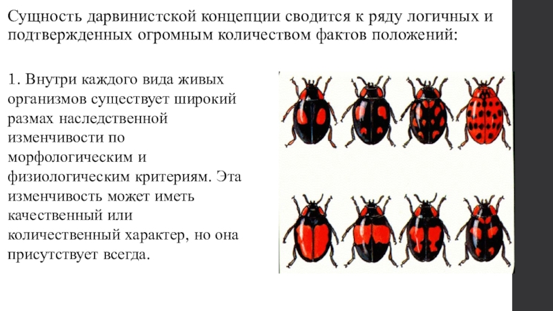 1. Внутри каждого вида живых организмов существует широкий размах наследственной изменчивости по морфологическим и физиологическим критериям. Эта изменчивость может иметь качественный или количественный характер, но она присутствует всегда.